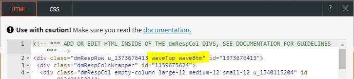 To add waves to other rows: Go into the ROW CSS/HTML and add the class "waveTop" for waves on the top or "waveBtm" for wave on the bottom.